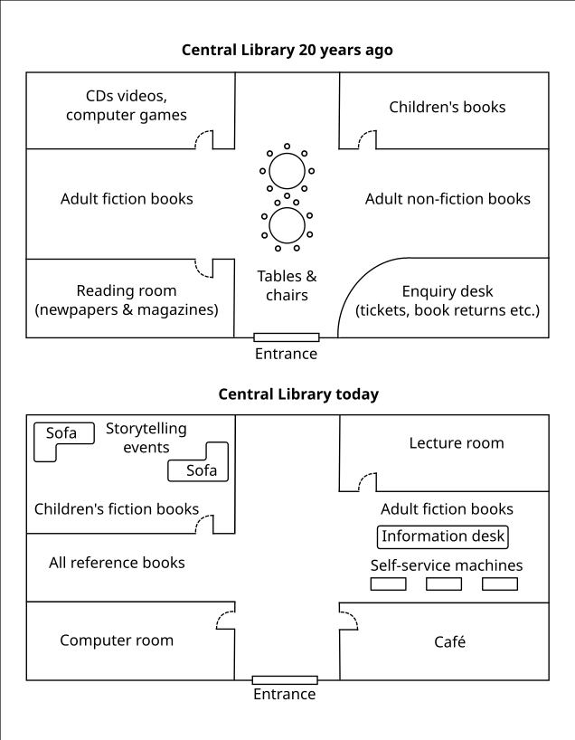 The diagram below shows the floor plan of a public library 20 years ago and how it looks now. Summarise the information by selecting and reporting the main features, and make comparisons where relevant.